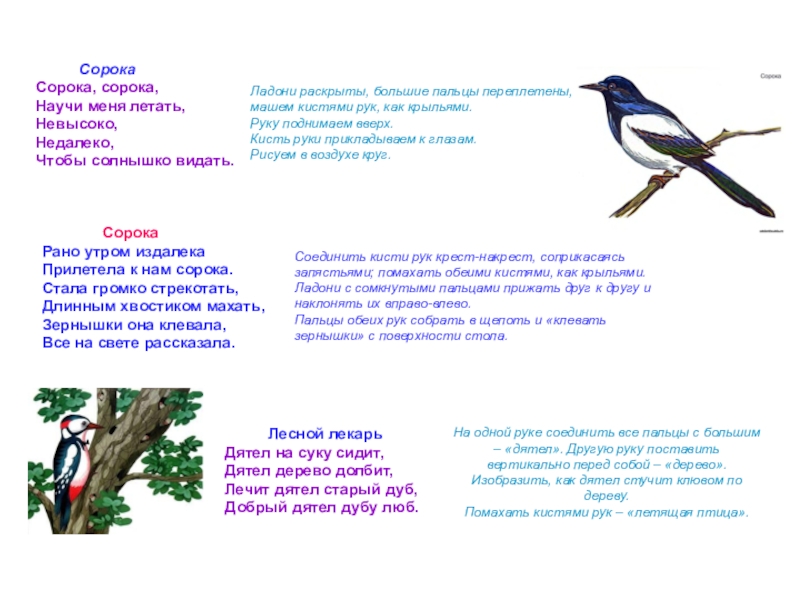 Один дятел, два дятла, три дятла, четыре дятла, пять дятлов; одна сорока, две сороки, три сороки, четыре сороки, пять сорок.