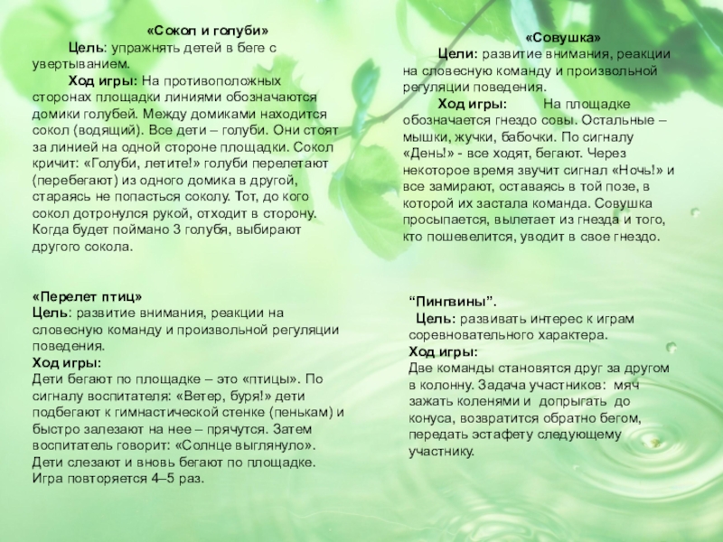 На площадке (в зале) раскладываются несколько больших обручей — «домиков для голубей». По сигналу педагога «Голуби, летите! » «голуби» вылетают из гнезд-домиков и летают по всей площадке, «кот» в это время старается поймать как можно больше «голубей». По второму сигналу педагога «Голуби, домой! » «птицы» летят в свои домики. Педагог вместе с детьми подсчитывает, сколько «голубей» поймал «кот».