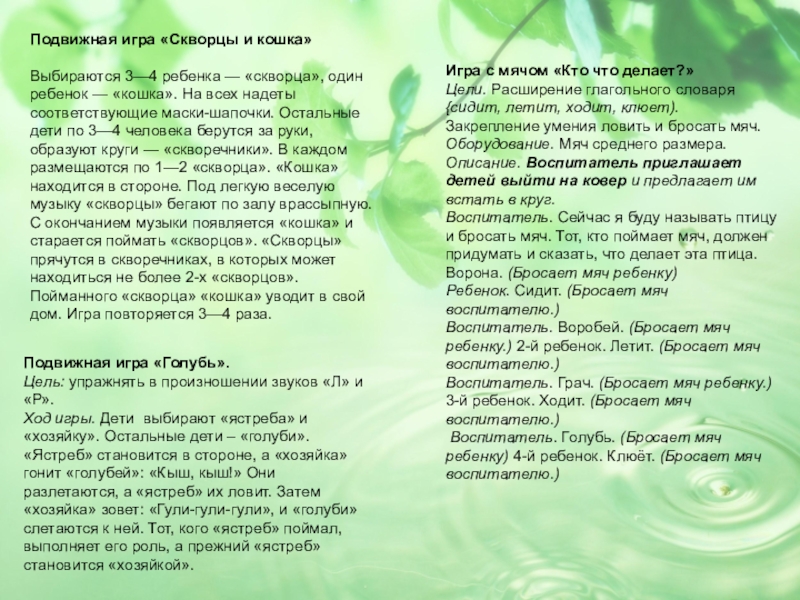 Воспитатель. Голубь. (Бросает мяч ребенку) 4-й ребенок. Клюёт. (Бросает мяч воспитателю.)