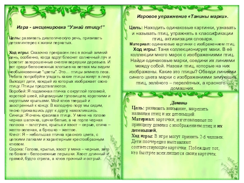 Взрослый описывает внешние признаки птицы, а дети называет ее.