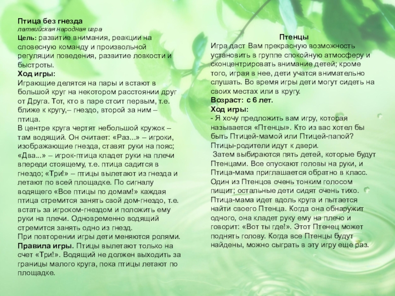 Игра даст Вам прекрасную возможность установить в группе спокойную атмосферу и сконцентрировать внимание детей; кроме того, играя в нее, дети учатся внимательно слушать. Во время игры дети могут сидеть на своих местах или в кругу.