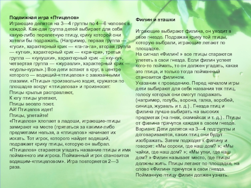 На сигнал «Филин! » все птицы стараются улететь в свои гнезда. Если филин успеет кого-то поймать, то он должен угадать, какая это птица, и только тогда пойманный становится филином.
