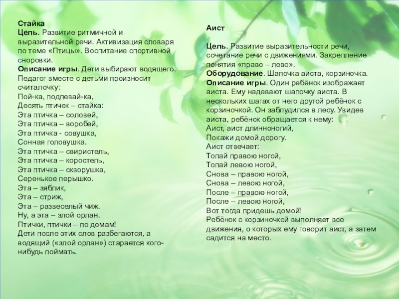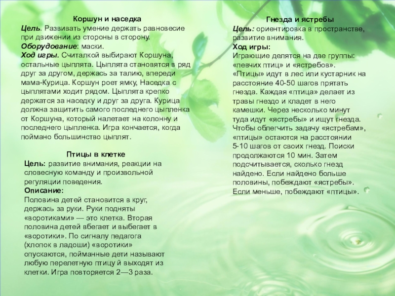 Ход игры Воспитатель предлагает детям вспомнить, как кричат гуси, утки, куры. Дети хором произносят звуки. «Вот хорошо, вы все вспомнили, как по-разному кричат домашние птицы. А как воркует голубь?» Если дети затрудняются, педагог сам произносит: «Грру-грру-грру-грру!» «А сейчас послушайте стихотворение. Когда я буду называть разных птиц, вы кричите, как они.