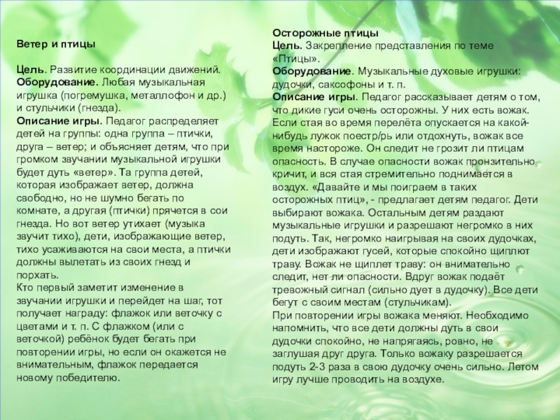Ход игры: Птичек ставят на стол у самого края. Педагог вызывает детей попарно. Каждый ребёнок садится напротив птички. Педагог предупреждает, что продвигать птичку можно лишь на одном выдохе, дуть несколько раз подряд нельзя. По сигналу «Полетели» дети дуют на фигурки. Остальные дети следят, чья птичка дальше улетит (проскользит по столу).