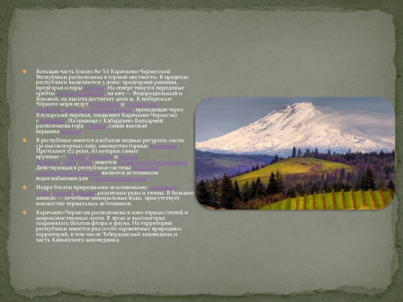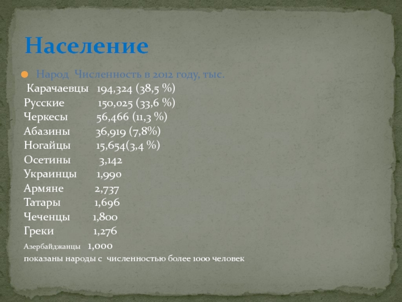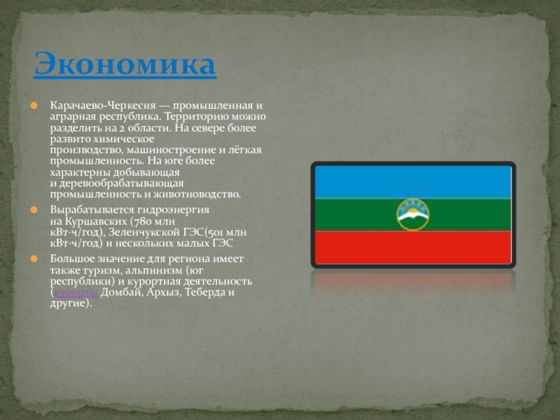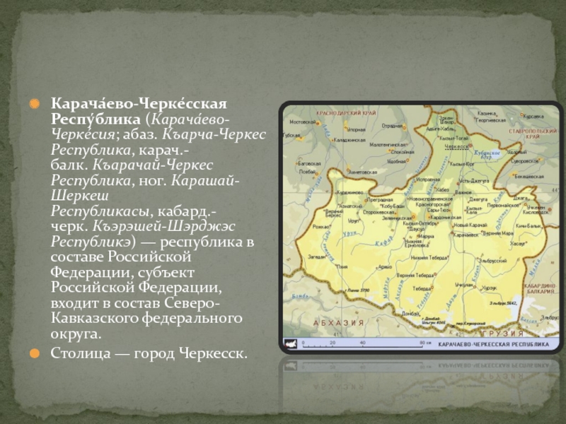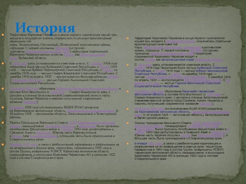Территория Карачаево-Черкесии в конце первого тысячелетия нашей эры входила в государство аланов, сохранились отдельные архитектурные памятники той поры: Зеленчукские, Сентинский, Шоанинский христианские храмы, городища. С первой половины XIX века (по русско-турецкому Адрианопольскому миру 1828) территория современной Карачаево-Черкесии входит в состав России как Баталпашинский отдел Кубанской области.