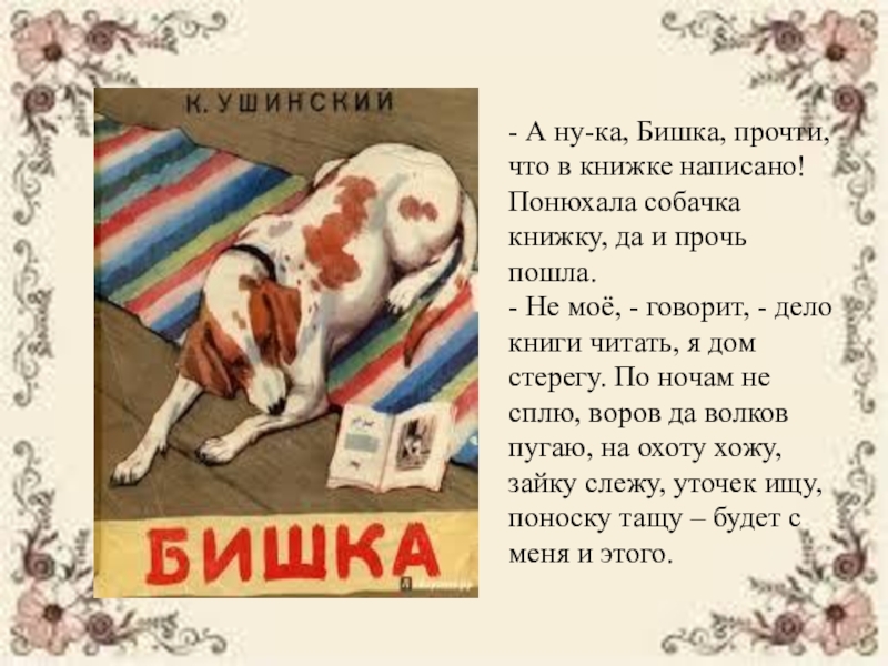 - Не моё, - говорит, - дело книги читать, я дом стерегу. По ночам не сплю, воров да волков пугаю, на охоту хожу, зайку слежу, уточек ищу, поноску тащу – будет с меня и этого.