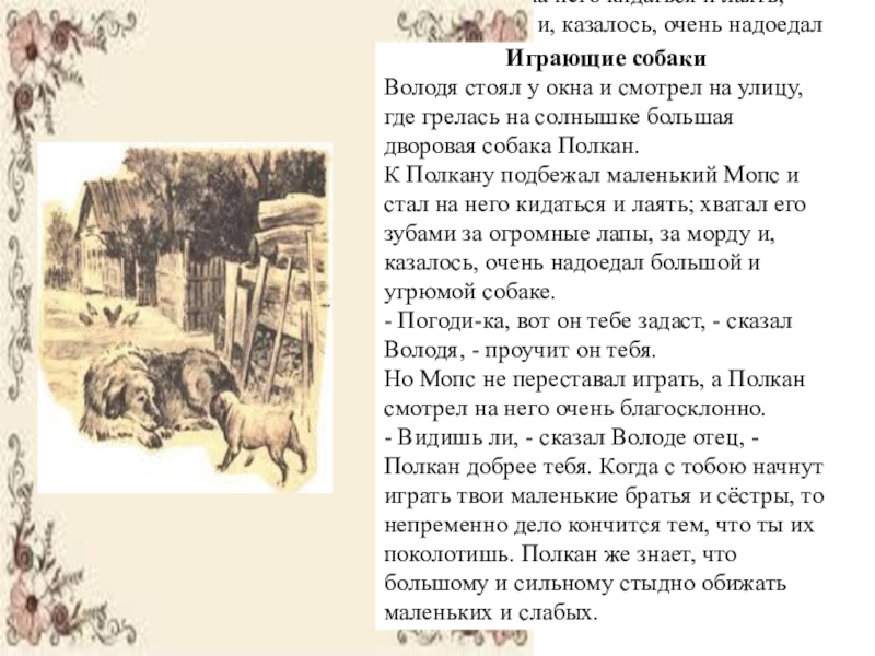 - Видишь ли, - сказал Володе отец, - Полкан добрее тебя. Когда с тобою начнут играть твои маленькие братья и сёстры, то непременно дело кончится тем, что ты их поколотишь. Полкан же знает, что большому и сильному стыдно обижать маленьких и слабых.