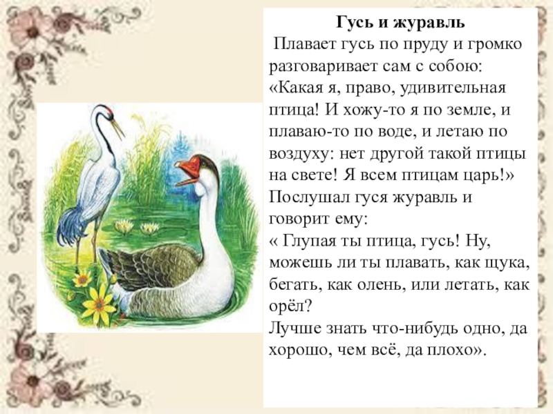 Плавает гусь по пруду и громко разговаривает сам с собою: «Какая я, право, удивительная птица! И хожу-то я по земле, и плаваю-то по воде, и летаю по воздуху: нет другой такой птицы на свете! Я всем птицам царь!»