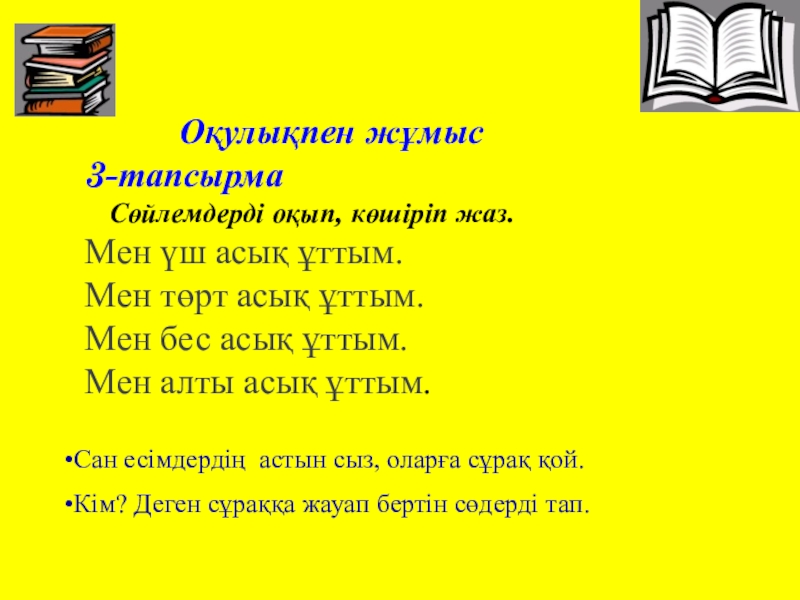 Сан есімдердің астын сыз, оларға сұрақ қой.