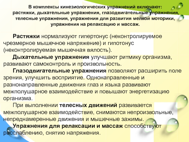 Слайд 14В комплексы кинезиологических упражнений включают: