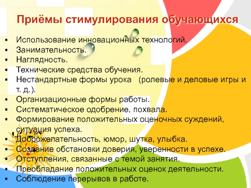 Познавательные: опора на жизненный опыт, учёт познавательных интересов, создание проблемных ситуаций, побуждение к поиску альтернативных решений, выполнение творческих заданий.
