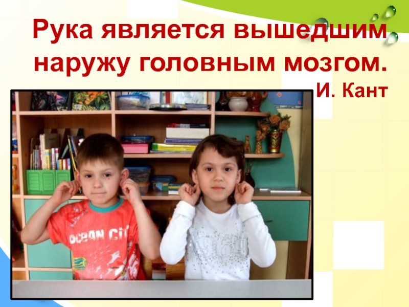 многих психических процессов. Учёными доказано положительное влияние манипуляций рук на функции высшей нервной деятельности, развитие речи, мышления, памяти, внимания, восприятия. Развивающая работа направлена от движения к мышлению, а не наоборот.