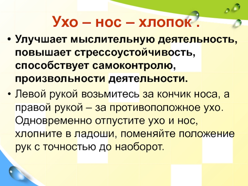 Левой рукой возьмитесь за кончик носа, а правой рукой – за противоположное ухо. Одновременно отпустите ухо и нос, хлопните в ладоши, поменяйте положение рук с точностью до наоборот.