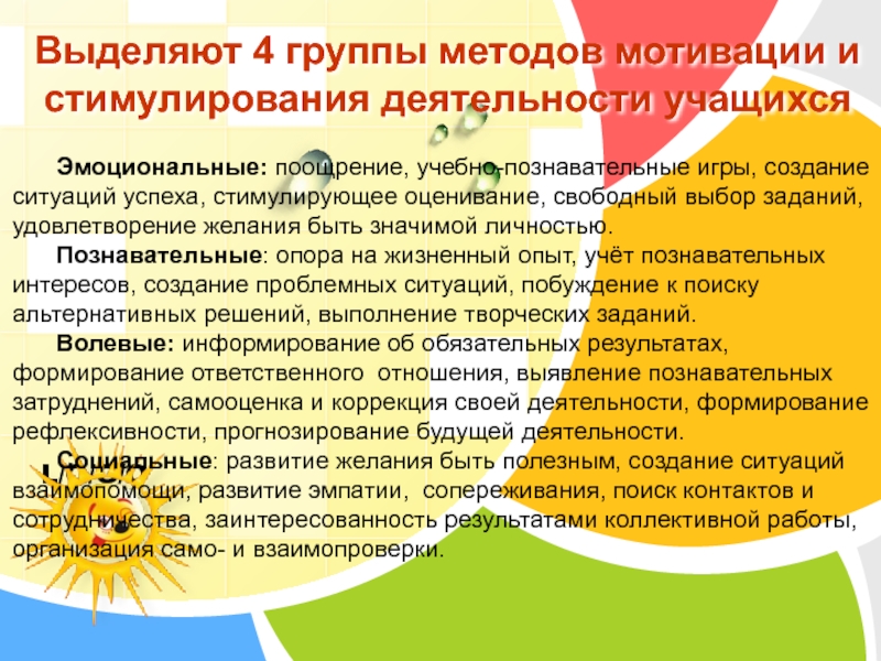 Слайд 3Выделяют 4 группы методов мотивации и стимулирования деятельности учащихся
