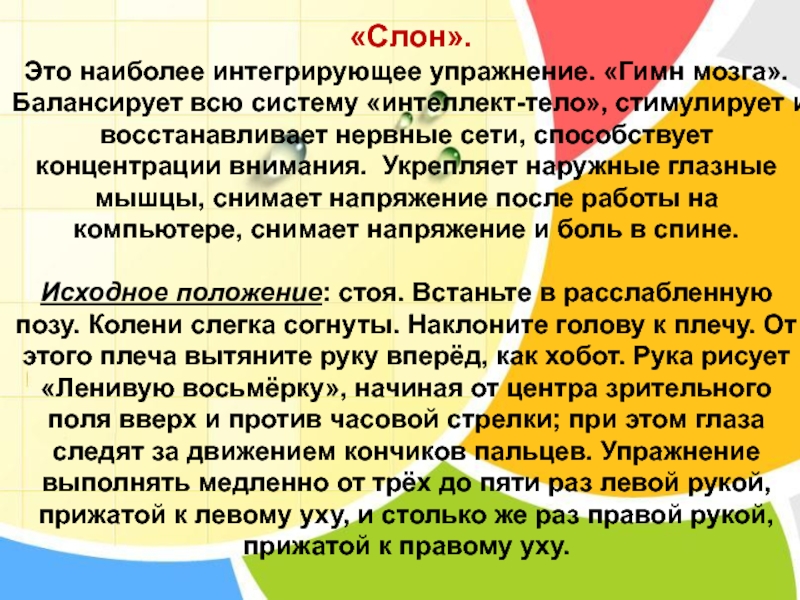 Это наиболее интегрирующее упражнение. «Гимн мозга». Балансирует всю систему