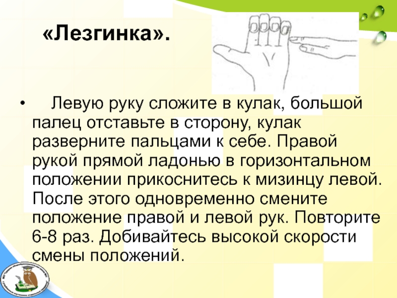 отставьте в сторону, кулак разверните пальцами к себе. Правой рукой прямой ладонью в горизонтальном положении прикоснитесь к мизинцу левой. После этого одновременно смените положение правой и левой рук. Повторите 6-8 раз. Добивайтесь высокой скорости смены положений.