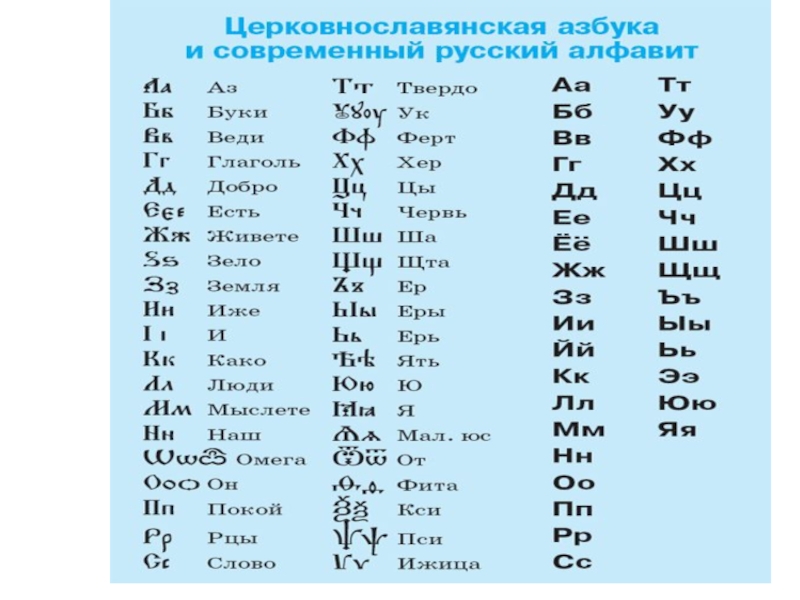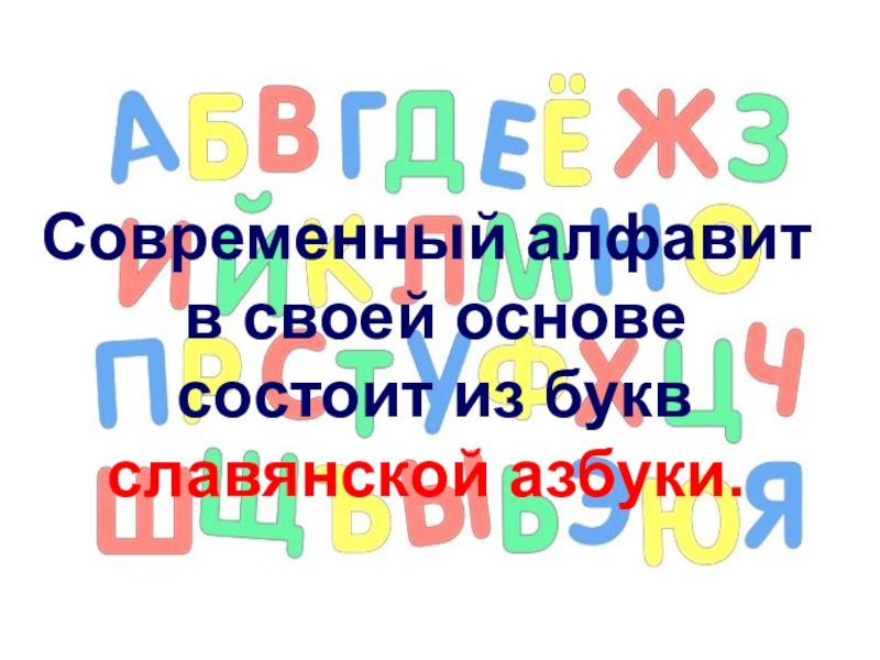 Современный алфавит в своей основе состоит из букв славянской азбуки.