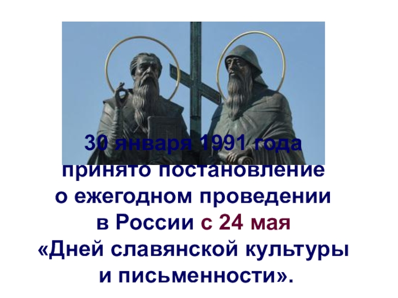 30 января 1991 годапринято постановлениео ежегодном проведениив России с 24 мая«Дней славянской культуры и письменности».