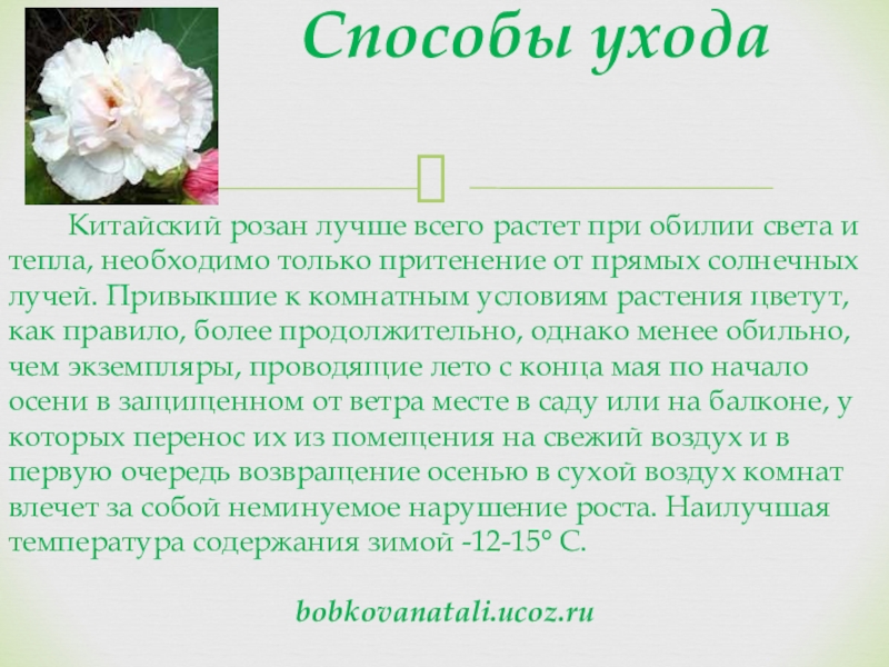 Китайский розан лучше всего растет при обилии света и тепла, необходимо только притенение от прямых солнечных лучей. Привыкшие к комнатным условиям растения цветут, как правило, более продолжительно, однако менее обильно, чем экземпляры, проводящие лето с конца мая по начало осени в защищенном от ветра месте в саду или на балконе, у которых перенос их из помещения на свежий воздух и в первую очередь возвращение осенью в сухой воздух комнат влечет за собой неминуемое нарушение роста. Наилучшая температура содержания зимой -12-15° С.
