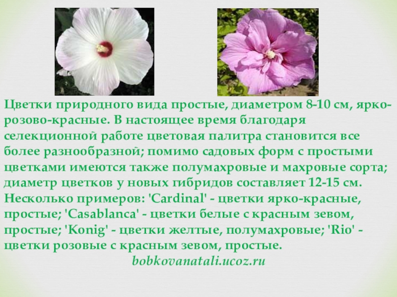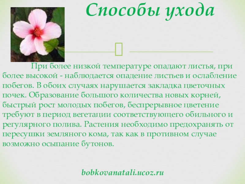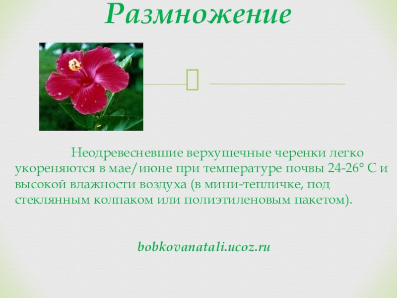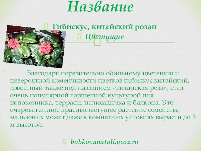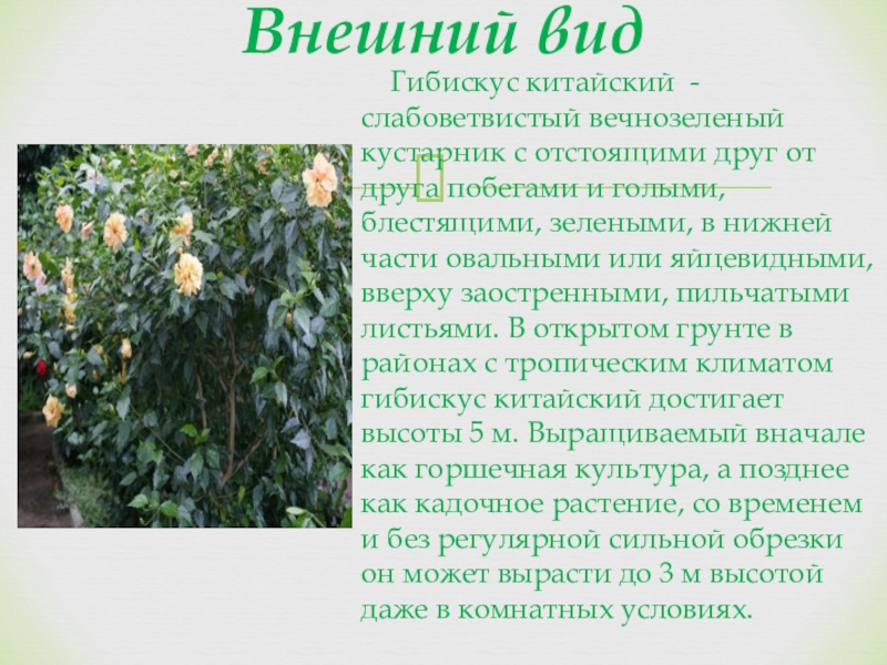 друг от друга побегами и голыми, блестящими, зелеными, в нижней части овальными или яйцевидными, вверху заостренными, пильчатыми листьями. В открытом грунте в районах с тропическим климатом гибискус китайский достигает высоты 5 м. Выращиваемый вначале как горшечная культура, а позднее как кадочное растение, со временем и без регулярной сильной обрезки он может вырасти до 3 м высотой даже в комнатных условиях.
