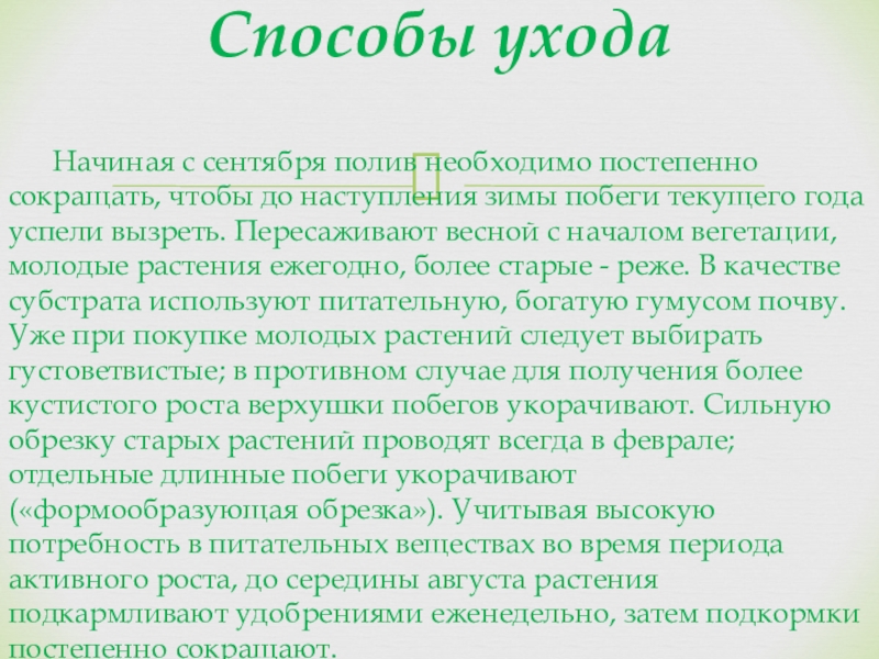 сокращать, чтобы до наступления зимы побеги текущего года успели вызреть. Пересаживают весной с началом вегетации, молодые растения ежегодно, более старые - реже. В качестве субстрата используют питательную, богатую гумусом почву. Уже при покупке молодых растений следует выбирать густоветвистые; в противном случае для получения более кустистого роста верхушки побегов укорачивают. Сильную обрезку старых растений проводят всегда в феврале; отдельные длинные побеги укорачивают («формообразующая обрезка»). Учитывая высокую потребность в питательных веществах во время периода активного роста, до середины августа растения подкармливают удобрениями еженедельно, затем подкормки постепенно сокращают.