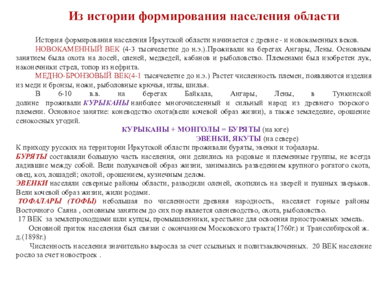 К приходу русских на территории Иркутской области проживали буряты, эвенки и тофалары.