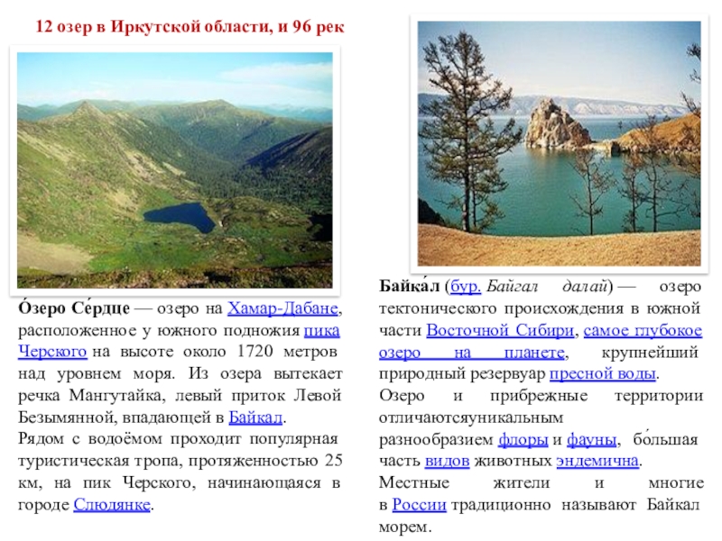 Слайд 9О́зеро Се́рдце — озеро на Хамар-Дабане, расположенное у южного подножия пика Черского на высоте около