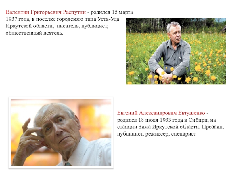 Валентин Григорьевич Распутин - родился 15 марта 1937 года, в поселке городского типа Усть-Уда Иркутской области, писатель, публицист, общественный деятель.