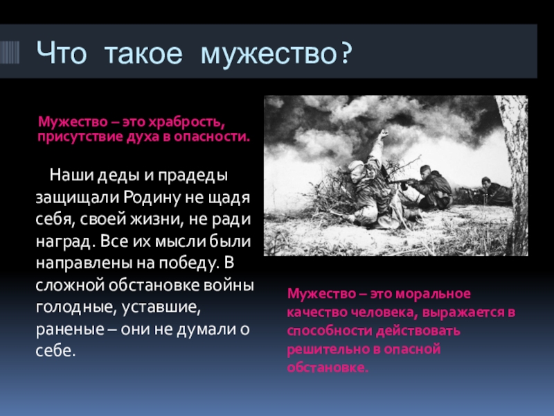 Наши деды и прадеды защищали Родину не щадя себя, своей жизни, не ради наград. Все их мысли были направлены на победу. В сложной обстановке войны голодные, уставшие, раненые – они не думали о себе.