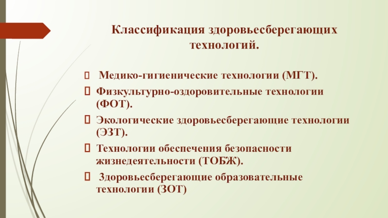 Классификация здоровьесберегающих технологий.  Медико-гигиенические технологии (МГТ). Физкультурно-оздоровительные технологии (ФОТ). Экологические здоровьесберегающие технологии (ЭЗТ). Технологии обеспечения безопасности жизнедеятельности (ТОБЖ). 3доровьесберегающие