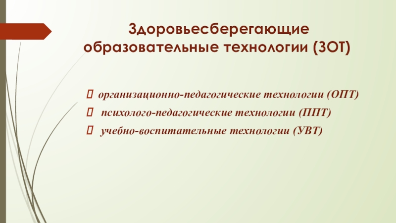 3доровьесберегающие образовательные технологии (ЗОТ) организационно-педагогические технологии (ОПТ) психолого-педагогические технологии (ППТ) учебно-воспитательные технологии (УВТ)