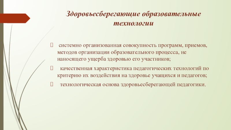 Здоровьесберегающие образовательные технологии системно организованная совокупность программ, приемов, методов организации образовательного процесса, не наносящего ущерба здоровью его
