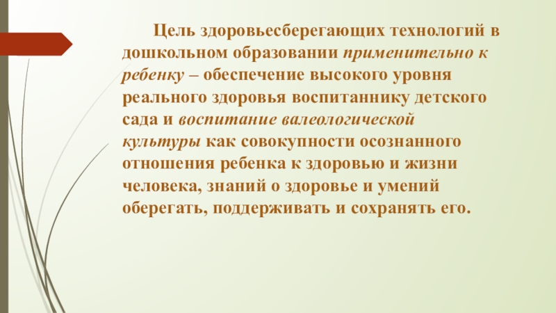 Цель здоровьесберегающих технологий в дошкольном образовании применительно к ребенку – обеспечение высокого уровня реального здоровья