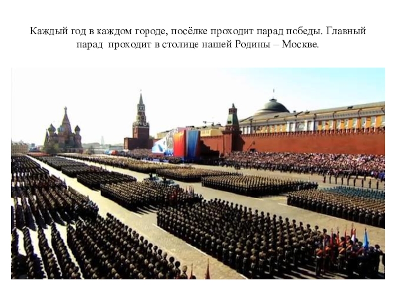Слайд 18Каждый год в каждом городе, посёлке проходит парад победы. Главный парад