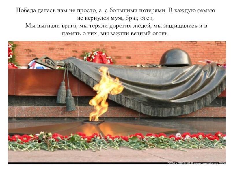 семью не вернулся муж, брат, отец. Мы выгнали врага, мы теряли дорогих людей, мы защищались и в память о них, мы зажгли вечный огонь.