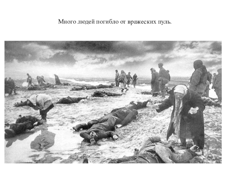 Слайд 13Много людей погибло от вражеских пуль.