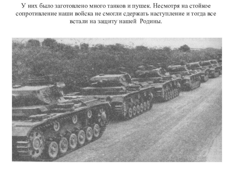 Слайд 4У них было заготовлено много танков и пушек. Несмотря на стойкое
