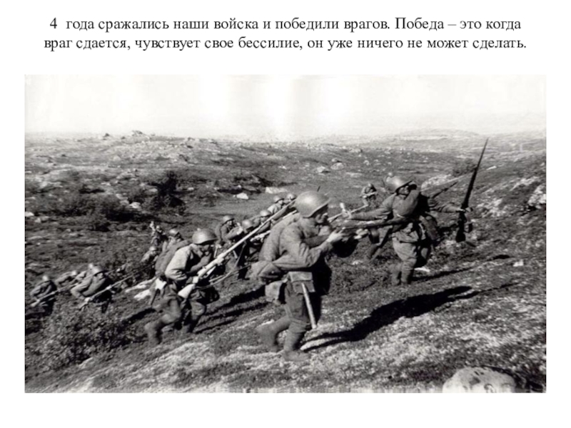 4 года сражались наши войска и победили врагов. Победа – это когда враг сдается, чувствует свое бессилие,