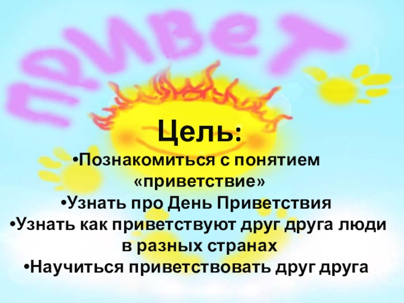 Цель: Познакомиться с понятием «приветствие»Узнать про День ПриветствияУзнать как приветствуют друг друга люди в разных странахНаучиться приветствовать друг друга