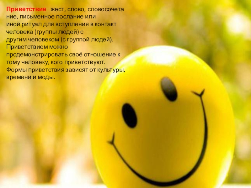 Слайд 3Приветствие   жест, слово, словосочетание, письменное послание или иной ритуал для вступления в контакт человека (группы людей) с