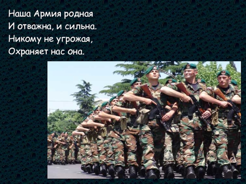 Наша Армия родная И отважна, и сильна.Никому не угрожая, Охраняет нас она.