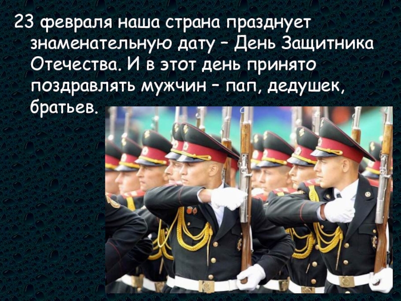 Слайд 223 февраля наша страна празднует знаменательную дату – День Защитника Отечества.