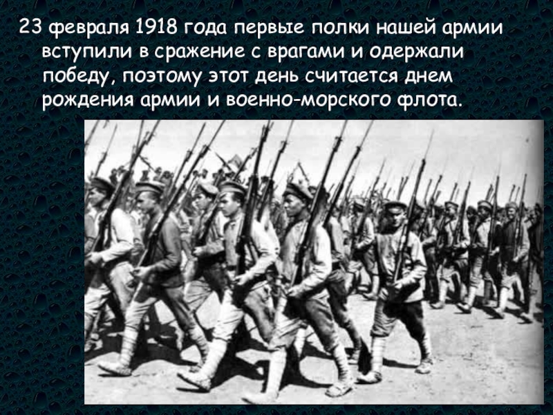Слайд 723 февраля 1918 года первые полки нашей армии вступили в сражение