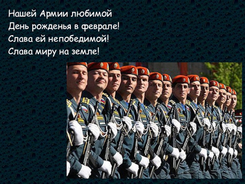Нашей Армии любимойДень рожденья в феврале!Слава ей непобедимой!Слава миру на земле!