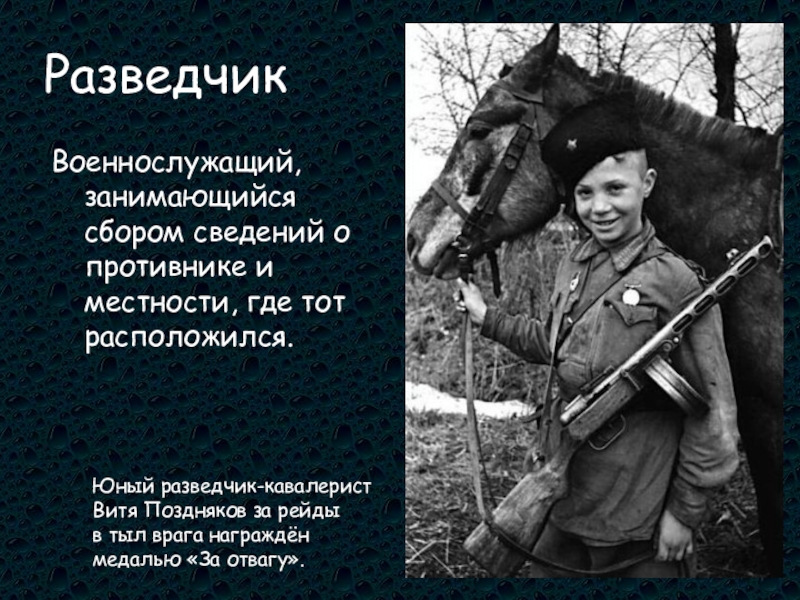 РазведчикВоеннослужащий, занимающийся сбором сведений о противнике и местности, где тот расположился.Юный разведчик-кавалерист Витя Поздняков за рейды в