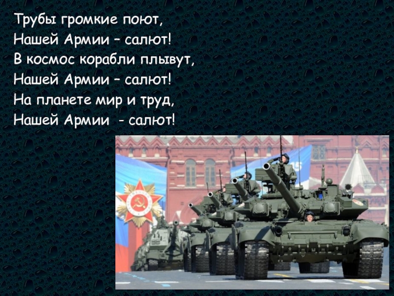 Трубы громкие поют,Нашей Армии – салют!В космос корабли плывут, Нашей Армии – салют!На планете мир и труд,