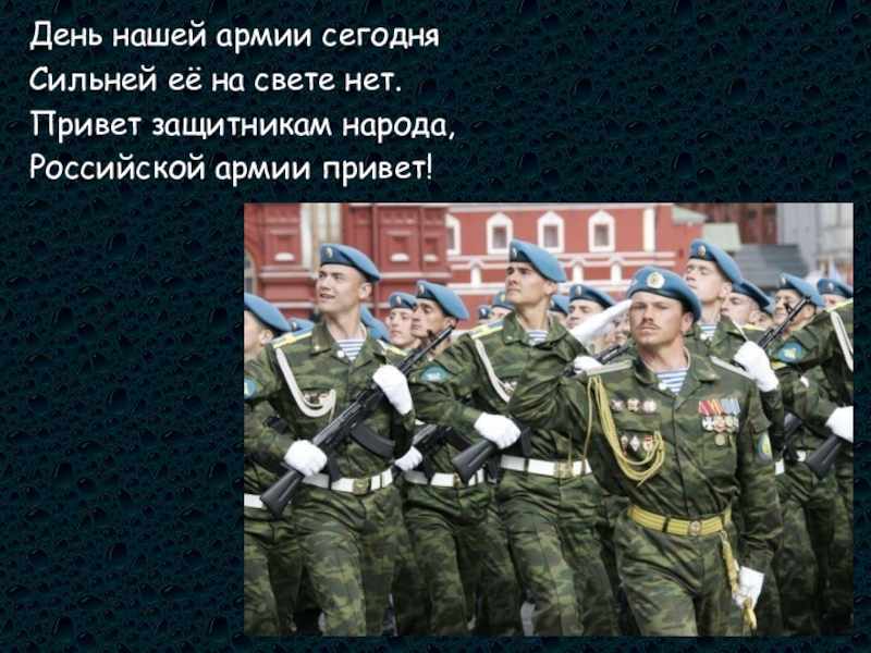 День нашей армии сегодняСильней её на свете нет.Привет защитникам народа,Российской армии привет!