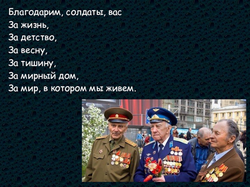 Благодарим, солдаты, васЗа жизнь, За детство, За весну, За тишину, За мирный дом, За мир, в котором