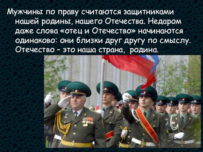 Слайд 3Мужчины по праву считаются защитниками нашей родины, нашего Отечества. Недаром даже