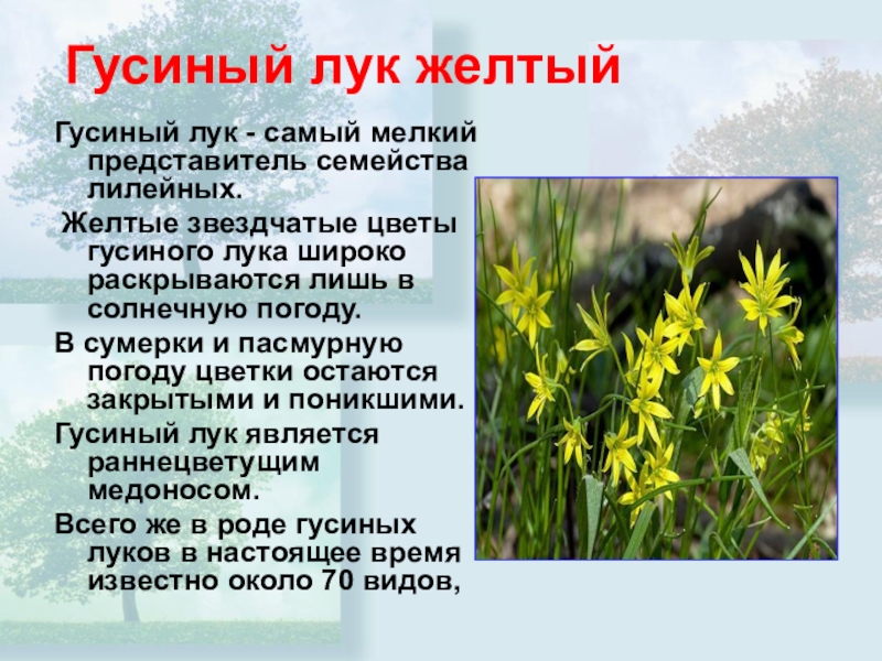 звездчатые цветы гусиного лука широко раскрываются лишь в солнечную погоду.